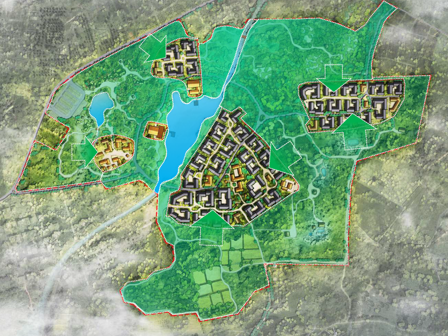 二、区域融合,激活地块及周边消极地块。本案规划设计中充分地利用了林地、水渠、农田等区域用地,融入景观、活动等体验设计中。将原本消极的用地,通过整合设计,形成有利的价值激活点;突破原有思考界限,实现建筑景观一体化。